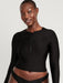 Fitted through body. Women's cropped rashguard swim top hits below the waist. High coverage. Models are wearing sizes S (numeric size 4), L (numeric size 12), and XL (numeric size 18).