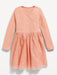 Toddler girl long-sleeve dress is fitted at top with a full skirt. Hits approximately at knee.