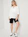Full panel waistband stretches over the belly for max support. Straight through hip and thigh. Maternity jean shorts hit at knee. 9" inseam. Model is approximately 5'9" and wears a size M (numeric size 8).