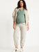 panel rolls up or down for added support straight through hip and thigh tapered leg hit at ankle 27 1/2" inseam model is approximately 5'9" and wears a size M (8)