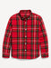 Relaxed fit through body. Boys long-sleeve patterned shirt hits below waist.