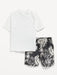 - Two-piece set includes solid color rashguard and coordinating printed swim trunks.