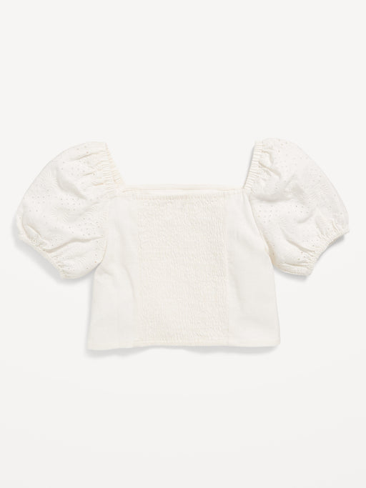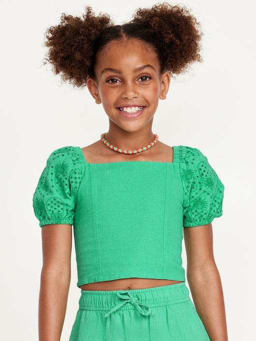 Short Puff-Sleeve Eyelet Linen-Blend Top for Girls