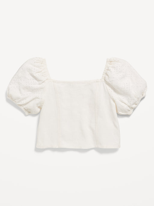 Short Puff-Sleeve Eyelet Linen-Blend Top for Girls