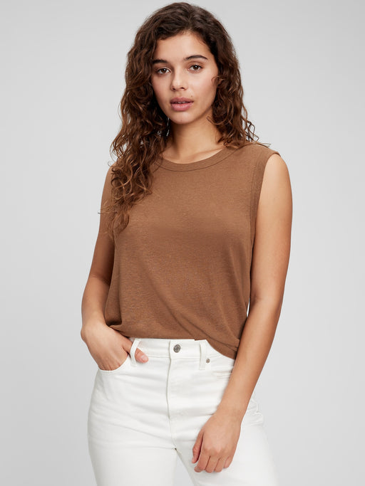 Linen Blend Muscle Sleeveless T-Shirt - brazen brown