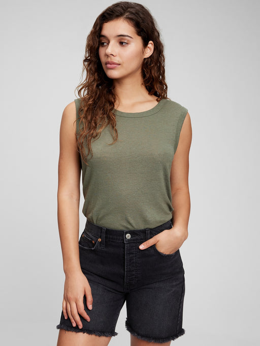 Linen Blend Muscle Sleeveless T-Shirt - mesculen green