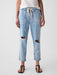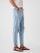 - Look: A distressed four-pocket jean in a light indigo wash. Raw, cuffed hem can be unrolled.