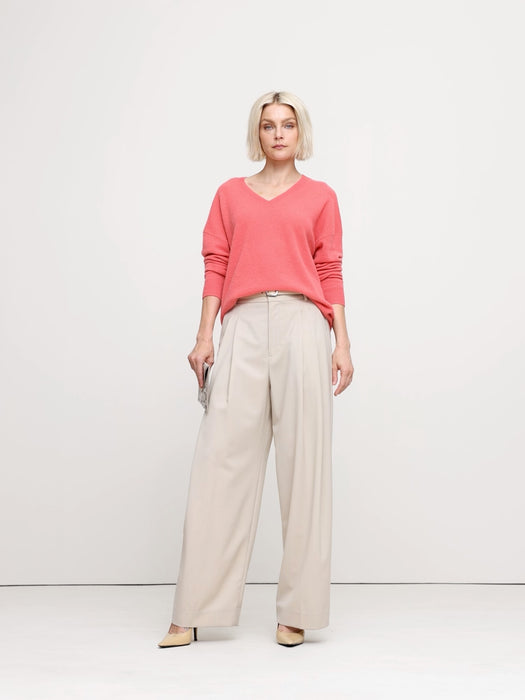 - The vibe is lightweight luxury. This updated take on the classic V-neck sweater has an oversized fit through the body and dropped shoulder sleeves. We knitted it from our lightweight cashmere yarn, selected for its luxurious softness and all-season weight.