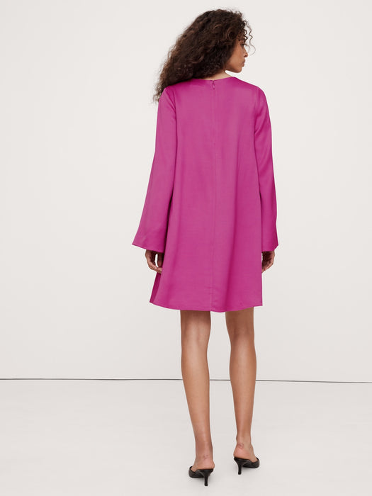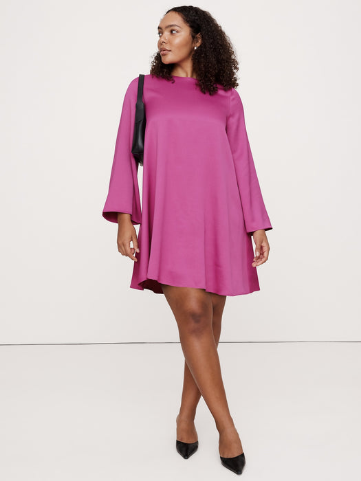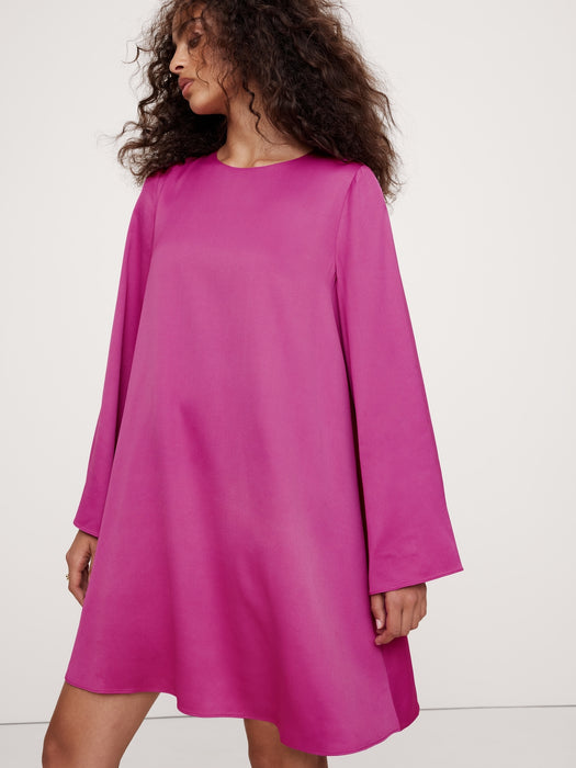 - We selected a beautiful satin crepe fabric from Italy for this mini dress, before cutting it with a swingy, trapeze silhouette and wide sleeves for a modern look.