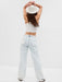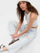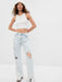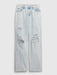 - Look: A distressed five-pocket jean in a light acid wash.