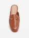 - Faux-leather upper, with buckle front detail, open mule heel, and pointed, square toe.
