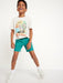 Sits at waist. Boys run shorts are relaxed through hip and thigh. Run shorts hit above knee. Model is approximately 4’5” and is wearing size M (numeric size 8).