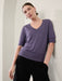 Semi-fitted, skims easily over the body Regular length, hits at low hip V-neck