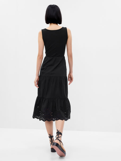 Eyelet Mixed Fabric Midi Dress