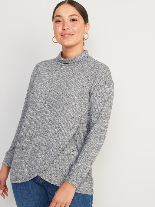 Maternity Cross-Front Rib-Knit Turtleneck Nursing Top - Gray