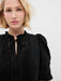 - Ruffled stand collar with ties.
