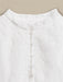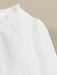 - Ruffle neck with picot edge and shank buttons and loop closure.