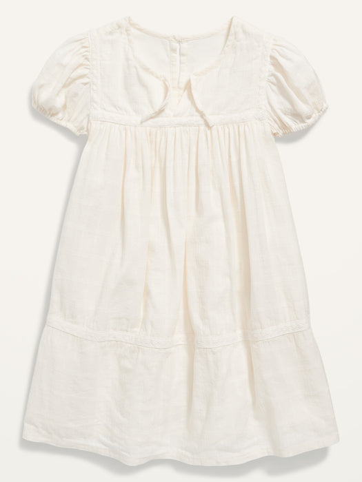 Crochet-Trim Dobby Tie-Neck Dress for Toddler Girls - White