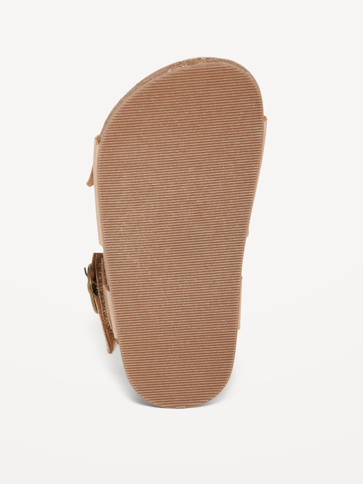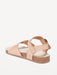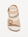 - Smooth, faux-leather upper, with buckled strap across foot.
