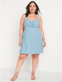 Fit & Flare Sleeveless Halter Chambray Mini Dress for Women