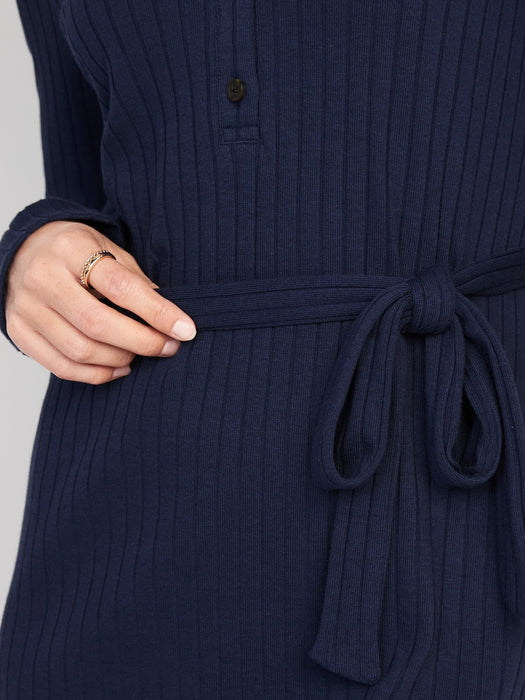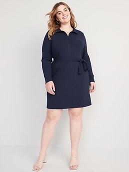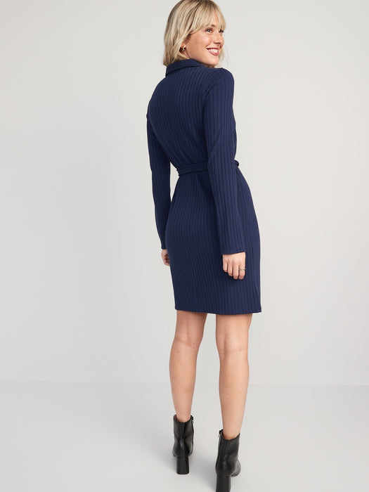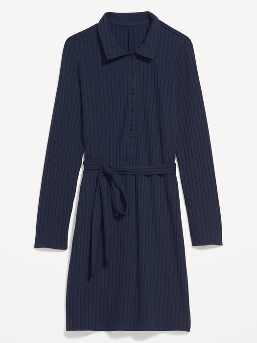Fitted Rib-Knit Tie-Belt Long-Sleeve Mini Polo Dress for Women