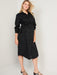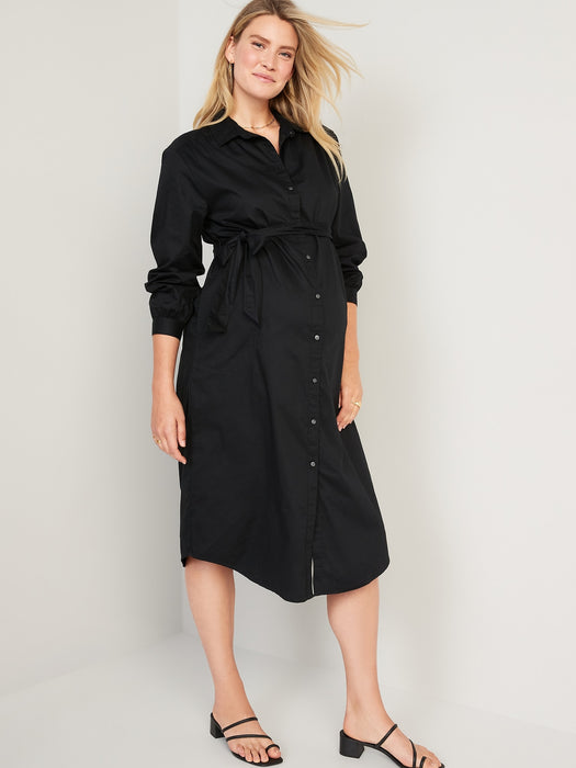 Relaxed through body, with a defined, tie-belt waist. Maternity midi shirt dress hits mid-calf. Model is approximately 5'8" and wears a size M (numeric size 8).