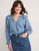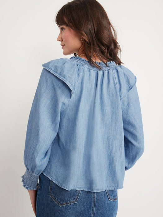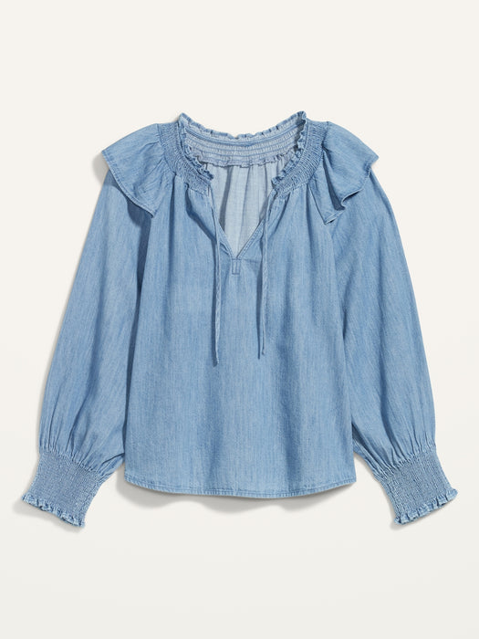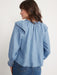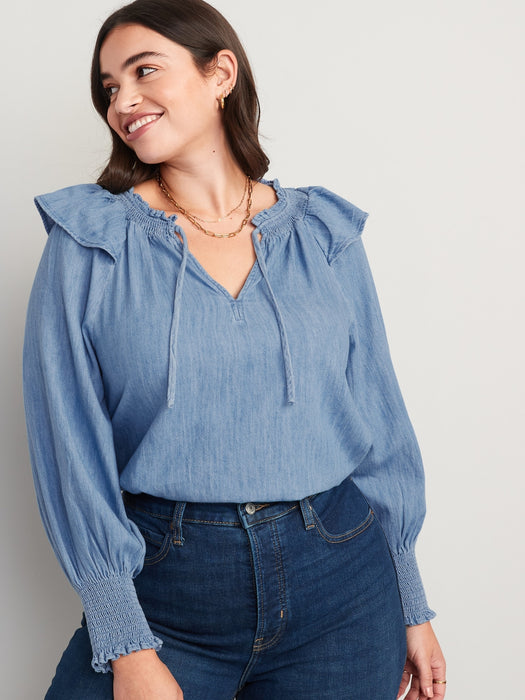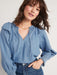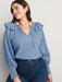 Puff-Sleeve Non-Stretch Jean Ruffle-Trimmed Poet Blouse for Women