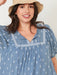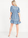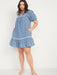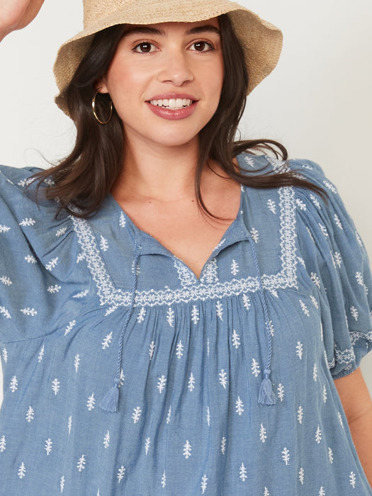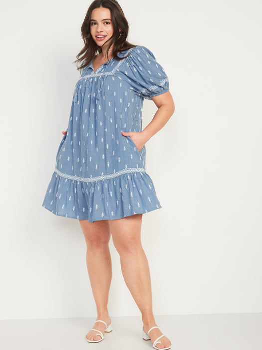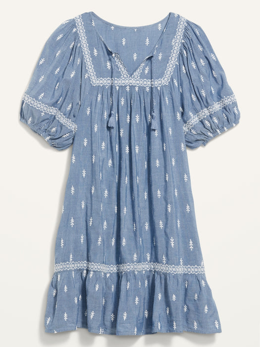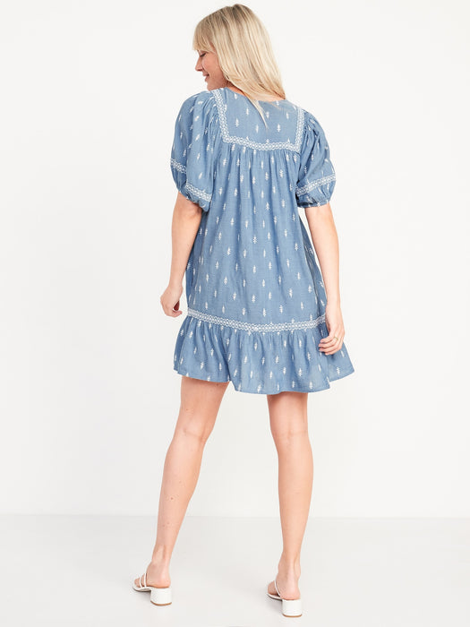 Puff-Sleeve Split-Neck Embroidered Mini Swing Dress for Women