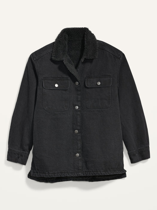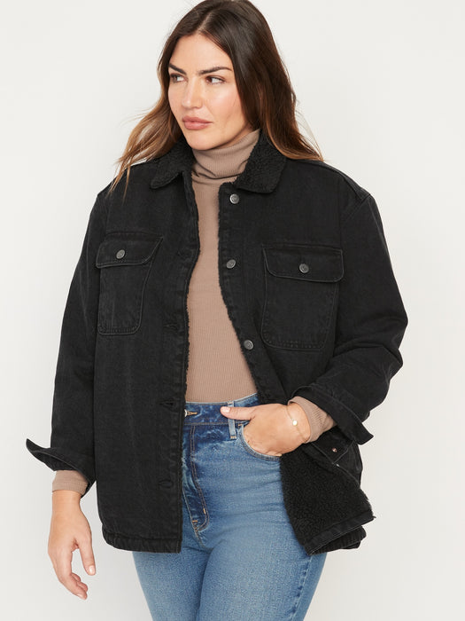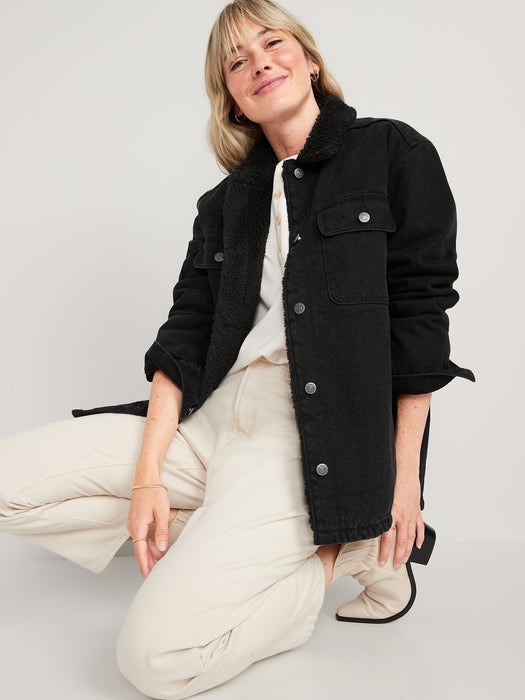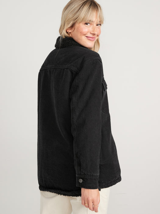 Sherpa-Lined Black-Wash Non-Stretch Jean Utility Shacket or Women