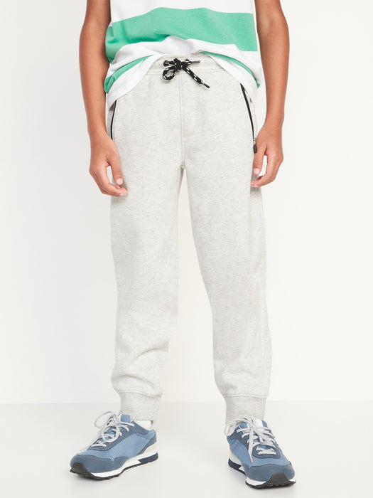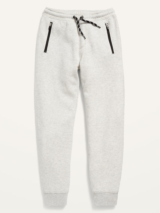 Boys fleece joggers sit below waist. Relaxed through hip and thigh. Tapered leg.